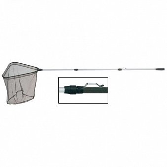 Длинный складной подсачек с треугольной формой сачка, телескопической ручкой и зажимом для крепления к поясу.
