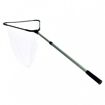 Складной подсачек с треугольной формой сачка с сеткой из лески и с телескопической рукояткой.