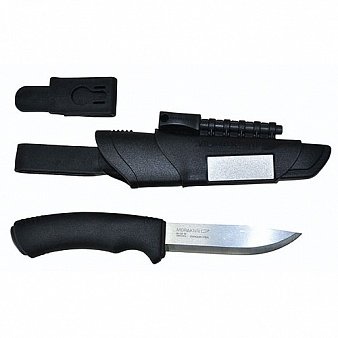 BUSHCRAFT SURVIVAL-нож с острейшим клинком, огниво и заточной брусок в одном комплекте. Клинок изготовлен из нержавеющей стали, прочен и стоек в течении длительного времени, его длина 106 мм. Обух клинка изготовлен специально для использования его с огнивом. На ножнах установлен алмазный заточной брусок, что позволяет легко подправить лезвие. К комплекте ножа две клипсы для различного крепления.