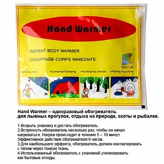 Вскройте упаковку и встряхните ее несколько раз. Положите пакет в карман или в варежку. Через 5 – 10 минут, в результате химической реакции содер-жимого с кислородом воздуха, обогреватель нагреется. В зависимости от окружающей температуры и теплоотдачи, рабочая температура обогрева-теля 40 - 60°С, эффективное время действия до 6 часов. Активные ингреди-енты обогревателя – железо, вода, целлюлоза, вермикулит, активированный уголь и соль. Все они не токсичны и не имеют запаха. Обогреватель одно-разового использования.