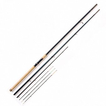 Трехколенный фидер быстрого строя с тестом до 180 г. Бланкизготовлен из высокомодульного графита IM7, что обеспечиваеттребуемую жесткость и хорошую посылистость. Фидер укомплектованпропускными кольцами со вставками SIC, пробковой рукояткой склассическим винтовым катушкодержателем. Соединение коленудилища по типу Over Steek. В комплект, в пластиковом тубусе,входят три графитовые вершинки с разной жесткостью.