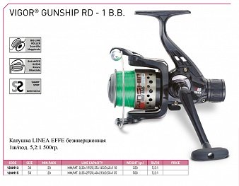 "Катушка Lineaeffe Vigor Gunship RD 50 – имеет всего одну графитовую шпулю, зато на нее уже намотана леска что позволит использовать катушку сразу из коробки и избавит от необходимости выбора лески. Современный дизайн и удобство использования помогут вам реализовать самые смелые рыболовные амбиции. При сборке все катушки данной марки проходят контроль качества. Задний фрикционный тормоз. Прочный и устойчивый к химическим воздействиям корпус катушки может легко фиксироваться на любое удилище при помощи специального кронштейна.