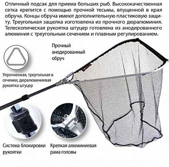 Отличный подсак для приема больших рыб. Высококачественная сетка крепится с помощью прочной тесьмы, впущенной в края обруча. Концы обруча имеют дополнительную пластиковую защиту. Треугольная защелка изготовлена из прочного дюралюминия. Телескопическая рукоятка штуцер готовлена из анодированного алюминия с треугольным сечением и плавным регулированием.