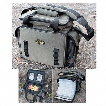 Удобная сумка для рыболовных принадлежностей• В комплекте пять пластиковых коробок, размером 28 х 18 х 4 (см), и две коробки, размером 20 х 13 х 4 (см), с многочисленными отделениями.• Верхнее отделение, удобное для перевозки катушек.• Двойная ручка и мягкий, регулируемый по длине, наплечный ремень.